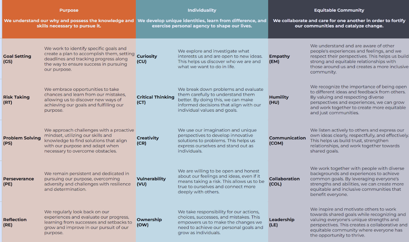 In Kindle, the school starts every day with what they call SPARK. Here they spend 40 minutes with their teacher coach. It resembles in many ways the CREW time that some of our schools have created. They are spending the first six weeks really drilling down to each of these competencies with students living the competencies in a piece of presentation at the end of each week – purpose, individually and equitable community.